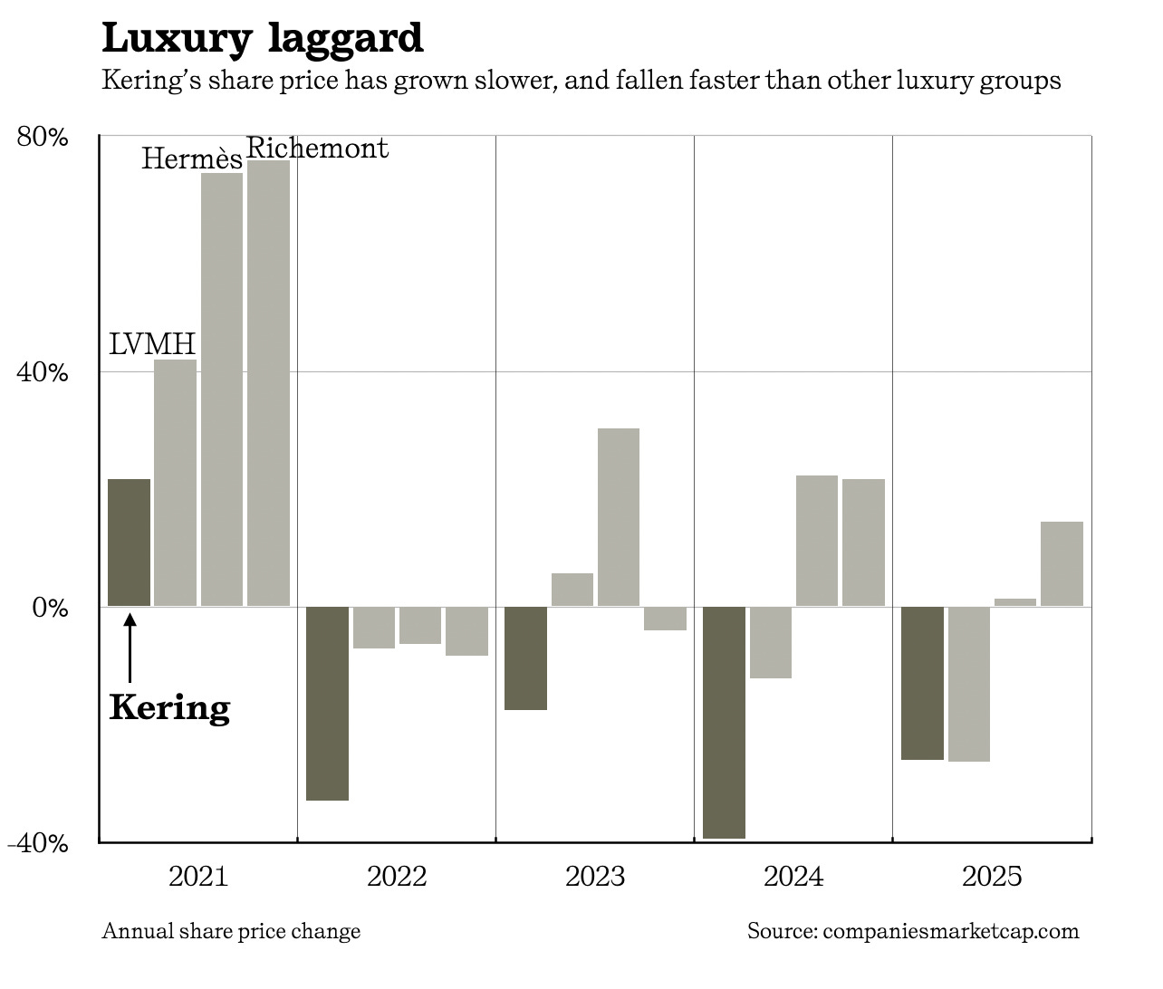 Debt at Kering has increased from €2.8 billion in 2019 to €10.5 billion in 2024. The Pinault family, which controls Kering through the holding company Artemis, has also run up debts from €3.5 billion in 2022 to over €6 billion in 2023, partly to fund the acquisition of Creative Artists Agency for an estimated $7 billion.