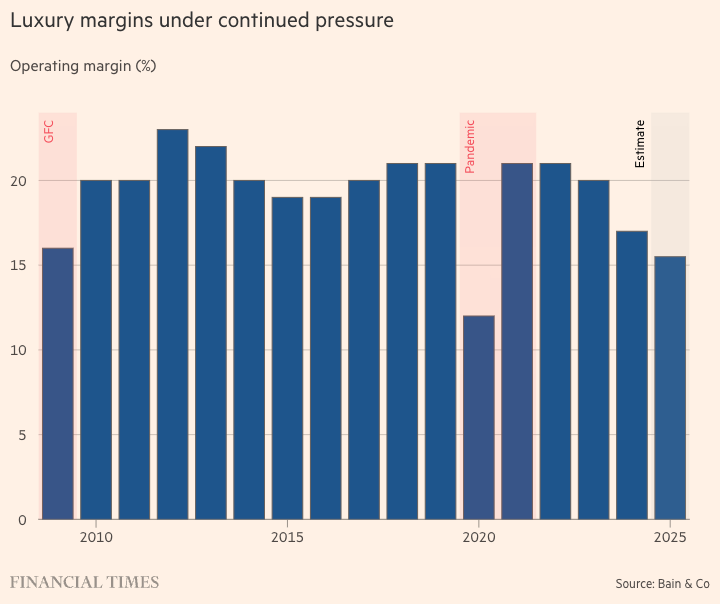 About 35 to 40 per cent of luxury goods were sold at a discount last year according to research by Bain and Italian luxury goods association Altagamma, a five percentage point increase on the level ten years ago. Luxury margins are under pressure amid stalling creativity at the major fashion houses, declining quality, skyrocketing prices since the pandemic and a decline in sales from China. That’s illustrated by this chart which shows the decline in margins for luxury firms, back to levels not seen since 2009, if you exclude the one-off pandemic hit. (FT)
